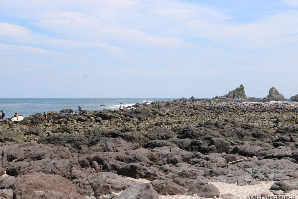 干潮になると海岸から三石までアーチを描くように陸地がつながり、磯遊びスポットとしても知られています。