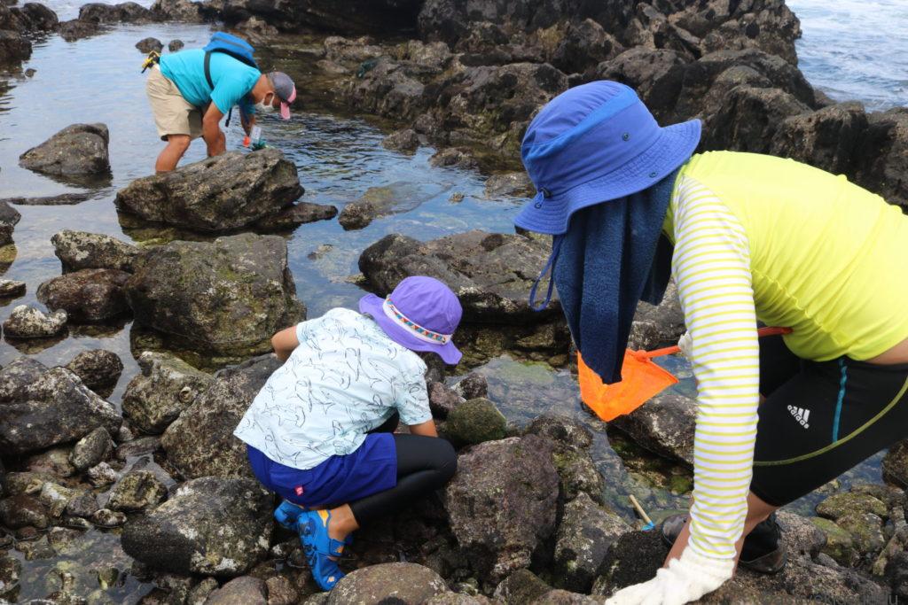 小さな子供は手前のタイドプールでのんびり水遊びを楽しむのもおすすめです。水がきれいなので、小さな子供でもタイドプールからのぞき込むだけでたくさんのカニやヤドカリ、ナマコを目にすることができます。