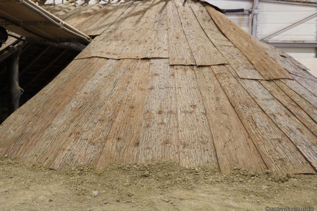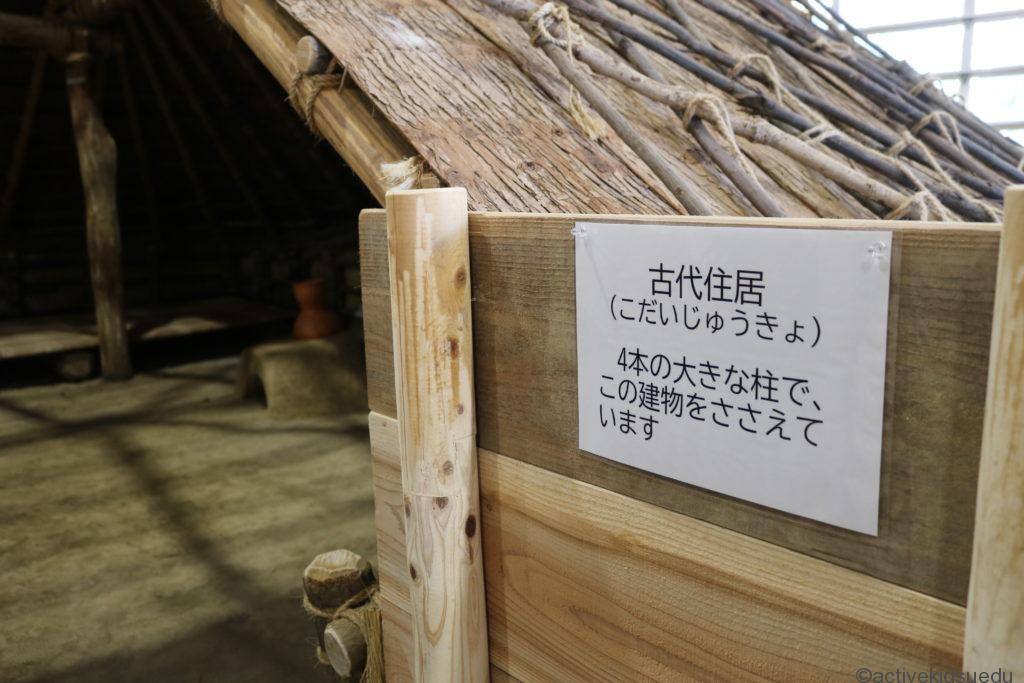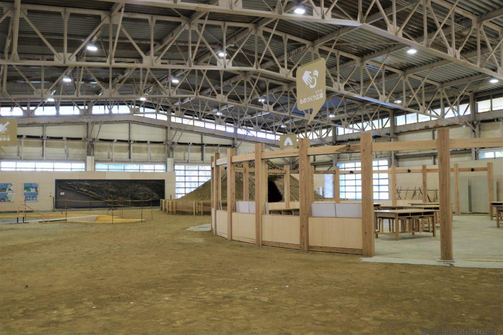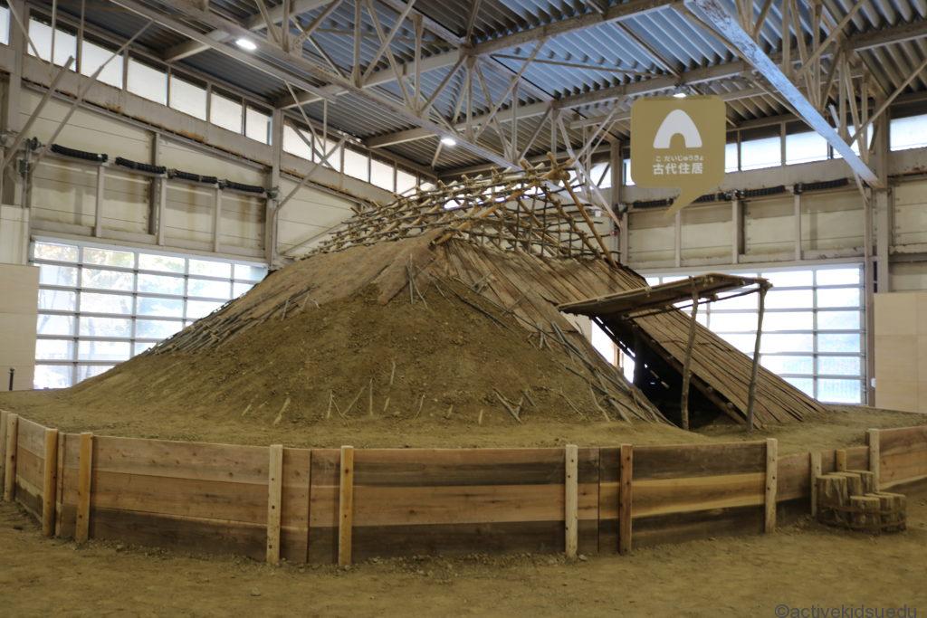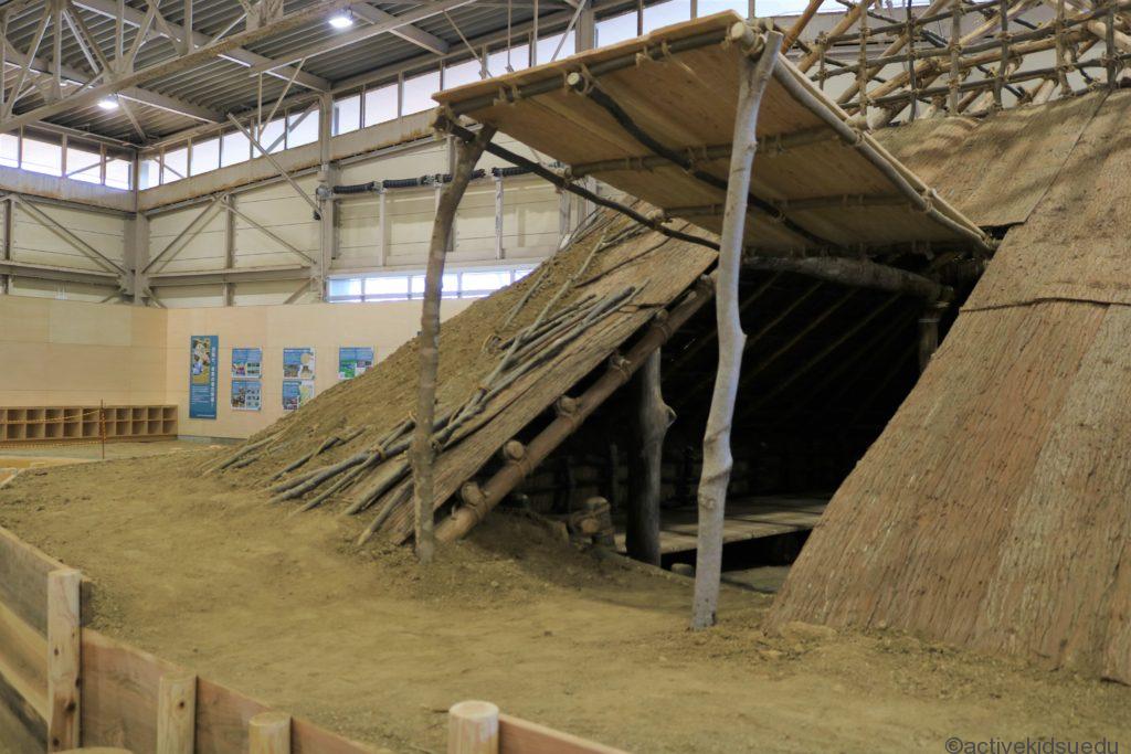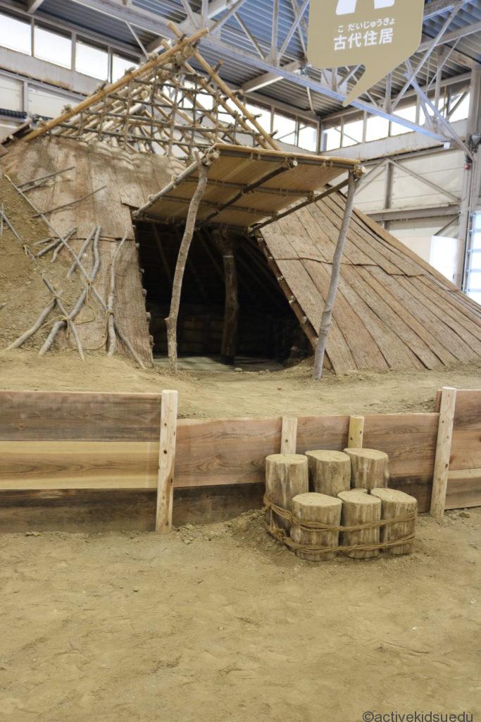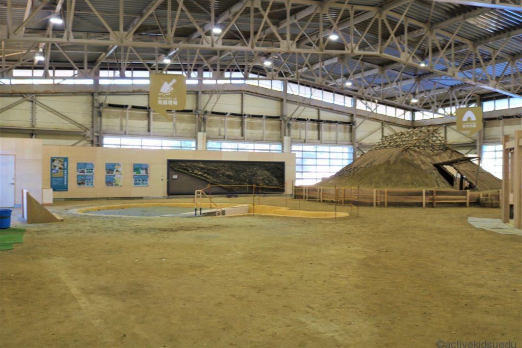 「歴史体験館」の入り口を入って右手には発掘体験コーナーと、竪穴住居潜入体験ができるエリアが見えます。