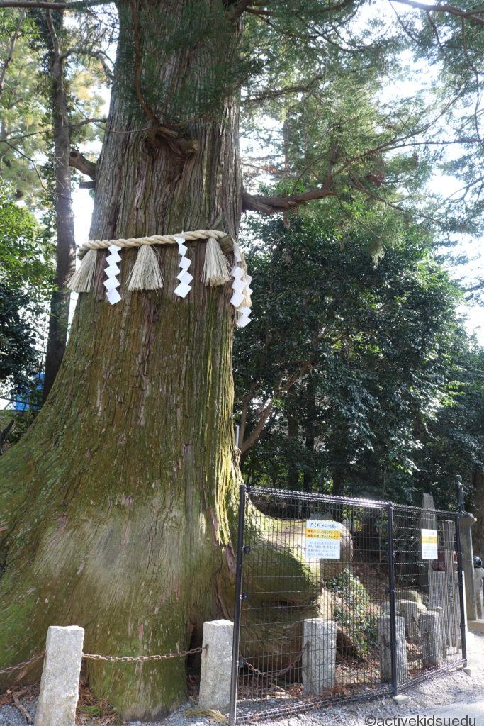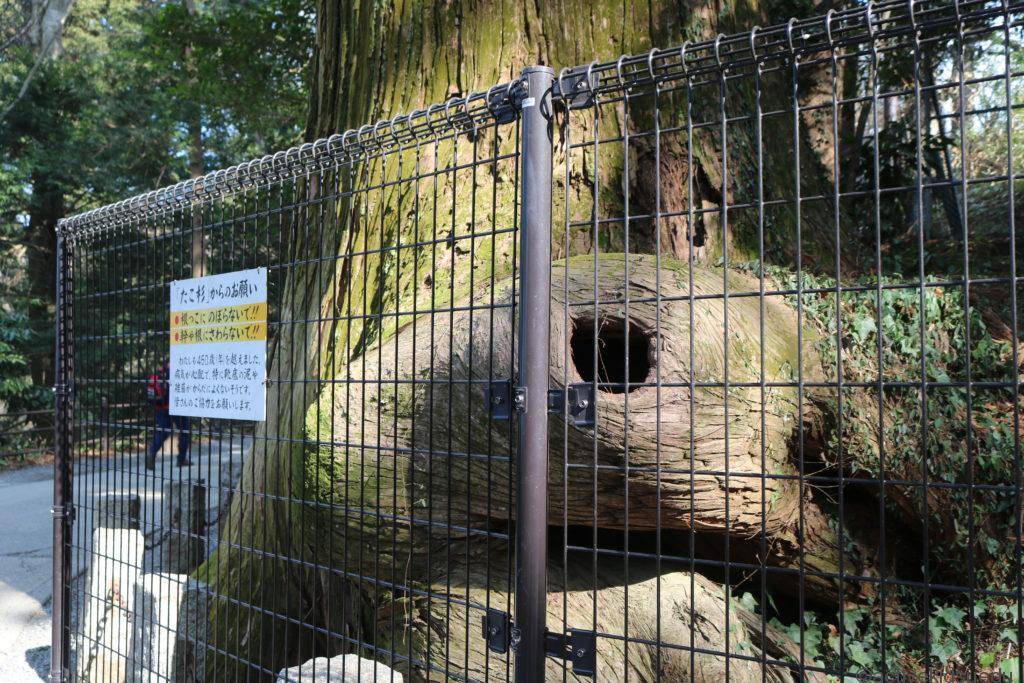 「さる園・野草園」を出てまた数分歩くと、パワースポットとしても知られる「たこ杉」が道の角に堂々と立っているのに出会います。