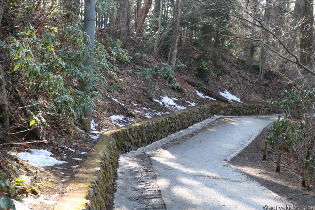ここまで登ってくると、道の両脇の日当たりの悪いところには少し雪が残っていました。