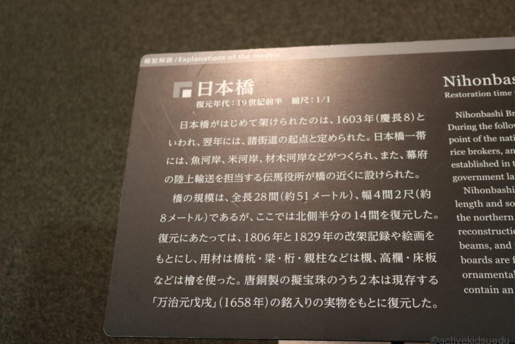 橋の規模は全長28間(約51メートル)。幅4間2尺(約8メートル)。江戸東京博物館では北側半分の約14間が再現されています。