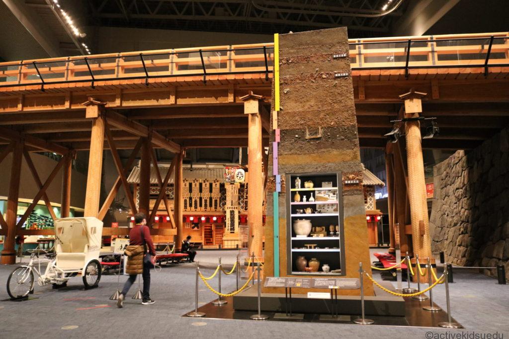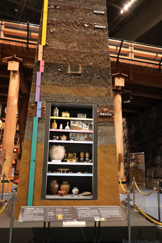 都立一橋高校の遺構から出土した遺物を棚に並べた地層です。