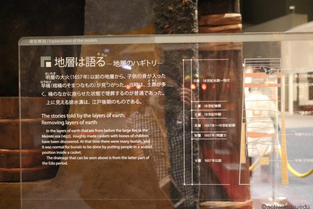 V層は1657年の明暦の大火以前のもの。IVそうは明暦の大火のときのもの、Ⅲ層は18世紀までのもの。Ⅱ層は18世紀中期ころのもの。Ⅰ層は18世紀後期のもの。0層は関東大震災までのものです。